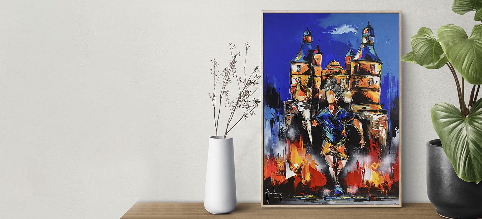 Réalisée par l’artiste peintre Christof Monnin, la toile illustrant le passage de la flamme olympique au pied du château est à gagner.